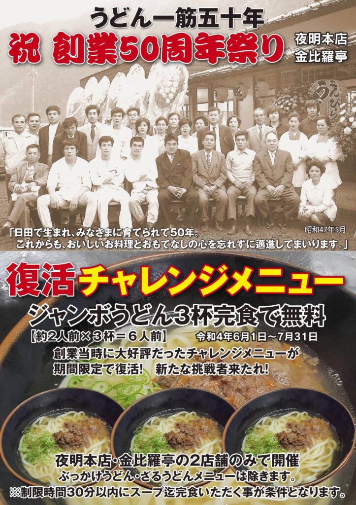 創業50周年祭り 復活チャレンジメニュー 2022年5月19日 更新情報 日田で生まれ、みなさまに育てられて50年 これからも、おいしいお料理とおもてなしの心を忘れずに邁進してまいります。 復活チャレンジメニュージャンボうどん3杯完食で無料